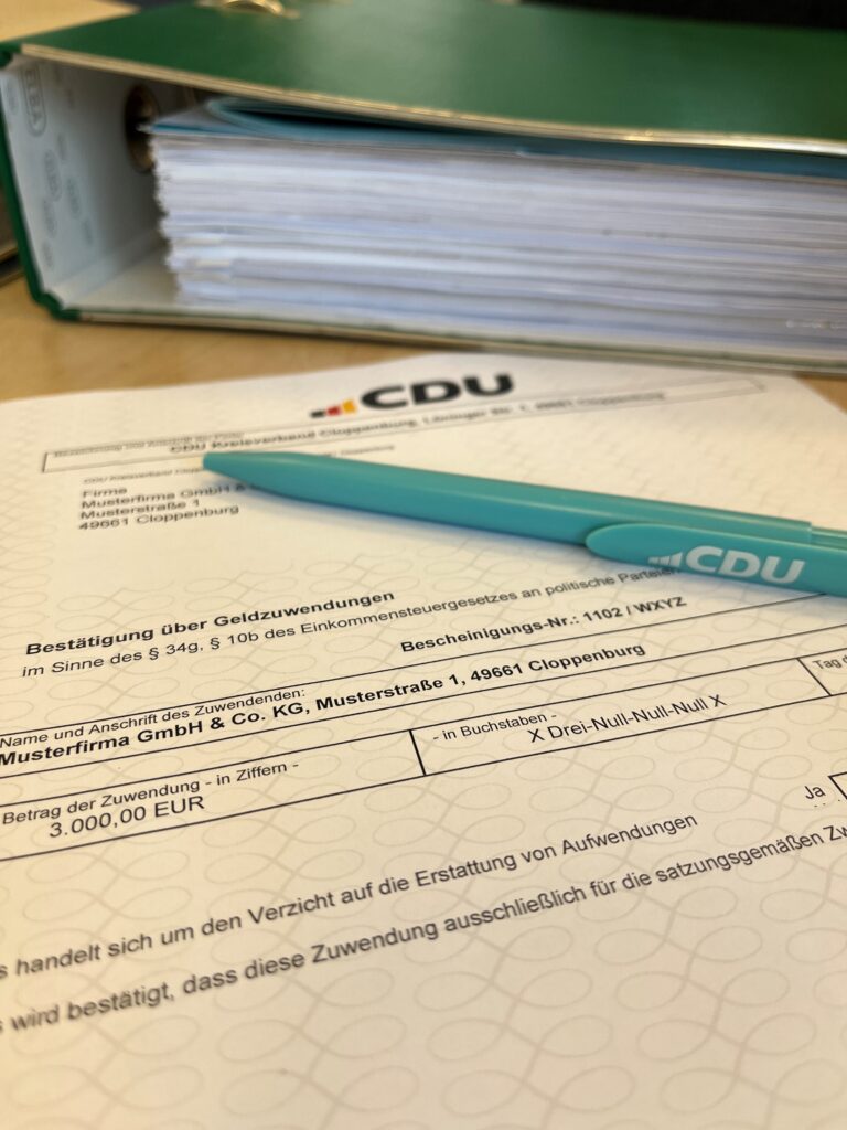 So kann die CDU-Kreisgeschäftsstelle die Spende direkt zuordnen und eine offizielle Spendenbescheinigung ausstellen.